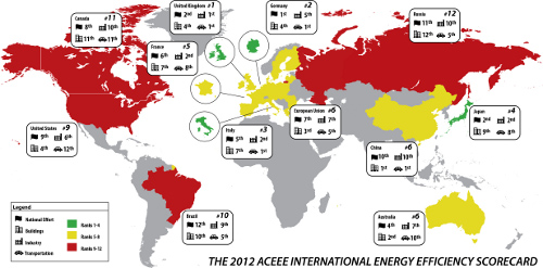 ACEEE memeringkatkan kedua belas negara sebagai berikut: (1) Inggris; (2) Jerman; (3) Italia; (4) Jepang; (5) Prancis; (6) Uni Eropa, Australia, dan China (ketiganya memiliki ranking yang sama); (9) AS; (10) Brasil; (11) Kanada; dan (12) Rusia.
