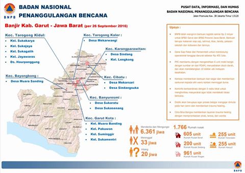 Infografis Banjir Kabupaten GarutBerikut adalah infografis bencana banjir di Kabupaten Garut, Provinsi Jawa Barat. Di dalamnya mencakup wilayah terdampak, jumlah korban jiwa dan hilang. Jumlah masyarakat yang masih dalam pengungsian, derita kerusakan dan upaya untuk mengatasinya. Semua informasi dari Badan Nasional Penanggulangan Bencana. Mari kembali bersama menjaga lingkungan untuk mengurangi risiko bencana akibat cuaca ekstrem.
