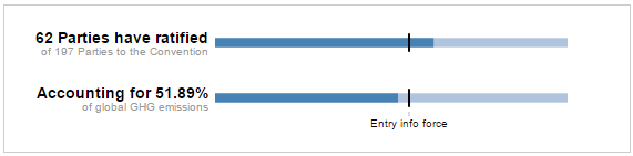 Dalam pasal 21 paragraf pertama Persetujuan Paris disebutkan, persetujuan ini baru bisa berlaku tiga puluh hari setelah setidaknya 55 negara dengan jumlah emisi gas rumah kaca kumulatif sebesar 55% dari emisi GRK dunia, telah menyerahkan persetujuan, penerimaan, ratifikasi mereka. Dunia kini menunggu negara-negara lain yang masuk dalam daftar 10 penghasil emisi gas rumah terbesar, termasuk Jepang dan Indonesia, untuk meratifikasi Persetujuan Paris.