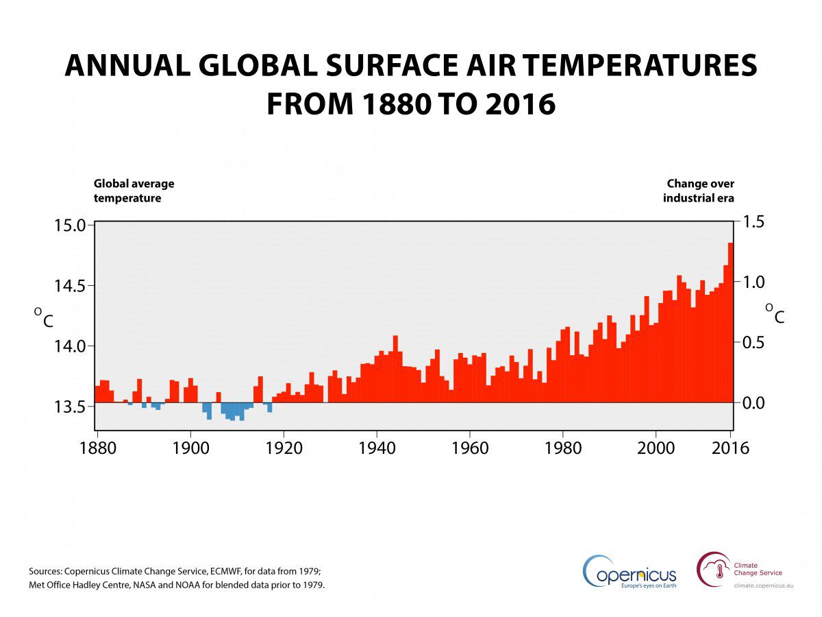 Dalam data terbaru C3S, yang menjadi bagian dari proyek Copernicus, program observasi bumi dari Uni Eropa, suhu tertinggi pada 2016 mencapai 14,8°C atau 1,3°C lebih tinggi dibanding tahun-tahun awal abad ke-18. Tahun terpanas sebelumnya adalah tahun 2015. Suhu di tahun 2016 0,2°C lebih tinggi dibanding 2015.