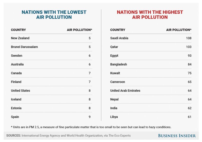 Saudi Arabia adalah negara dengan tingkat polusi tertinggi di dunia, diikuti oleh Qatar, Mesir, Bangladesh, Kuwait, Kamerun dan Uni Emirat Arab.