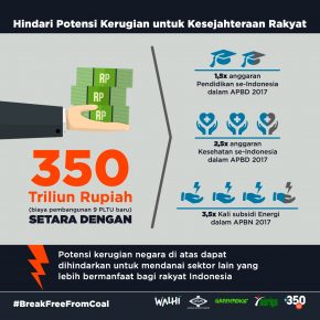 Jakarta, 19 Januari 2018 . Koalisi Break Free From Coal Indonesia meluncurkan analisis singkat potensi kerugian ekonomi negara yang akan sangat besar apabila proyek-proyek raksasa PLTU batubara di pulau Jawa dan Bali tetap dilanjutkan dan mulai beroperasi.