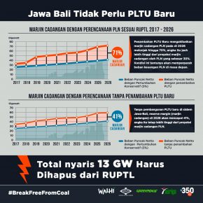 “Kami melakukan kalkulasi, dan melihat satu per satu proyek PLTU Batubara yang direncanakan di pulau Jawa dan Bali saat ini. Dari perhitungan kami, terdapat 9 proyek PLTU batubara yang seharusnya dibatalkan, demi menjaga kestabilan keuangan negara dan menghindari kerugian rakyat yang lebih besar lagi. Hampir semua proyek tersebut juga memiliki konflik lahan, dampak lingkungan, dampak kesehatan dan kerugian ekonomi pada masyarakat setempat,” ucap Dwi Sawung, Pengkampanye Energi dan Perkotaan WALHI.