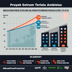Menilik kembali RUPTL 2017- 2026, total kapasitas PLTU batubara yang tercatat dalam dokumen tersebut mencapai sekitar 17 ribu MW. Apabila pertumbuhan ekonomi tidak sesuai dengan asumsi awal yaitu sebesar 7,2%, maka diperkirakan akan terjadi kerugian ekonomi yang sangat besar dari banyaknya listrik yang tidak terserap oleh para konsumen. Listrik tidak seperti beras sekali diproduksi tidak bisa disimpan di dalam gudang, teknologi baterai penyimpanan kita masih sangat lemah. Secara aktual, realisasi pertumbuhan penjualan listrik PLN selama 5 tahun terakhir apabila dirata-rata hanya mencapai 4,4%.
