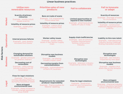 Linear Risks, demikian istilah yang dibuat oleh Circle Economy, et al. (2018), adalah “The exposure to the effects of linear business practices – utilise scarce and non-renewable resources; prioritise sales of new products; fail to collaborate; and fail to innovate or adapt – which will negatively impact an organisation’s ability to continue as a going concern.” Risiko-risiko yang sudah dipetakan ke dalam Matriks Risiko Linear (lihat Gambar 1) itu terdiri dari risiko legal, bisnis, operasi, dan pasar bagi para pelaku bisnis linear. Yang sangat penting untuk diingat adalah bahwa seluruh risiko tersebut pada akhirnya menjadi risiko bagi bank dan investor yang membiayainya.