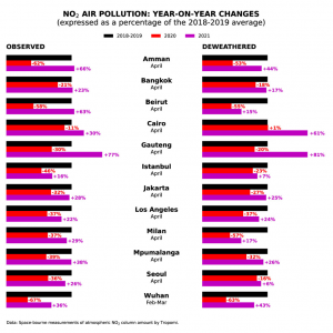 – Gauteng province, South Africa, where Johannesburg is located, saw the most dramatic increase in air pollution relative to pre-Covid conditions. NO2 pollution fell by approximately 30% in April 2020, but pollution during the same period in 2021 exceeded pre-pandemic levels by 47%.