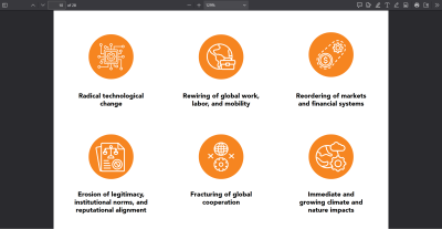 Kelima, kerjasama global sedang terfragmentasi. Lingkungan operasi yang kohesif yang memungkinkan kerangka kerja bersama dan aksi lintas-sektor memberikan jalan kepada lanskap regulasi, politik, dan pemangku kepentingan yang berbeda-beda. Ini meningkatkan risiko, biaya, dan ketidakpastian, sambil melemahkan kapasitas kolektif untuk mengatasi isu sistemik seperti perubahan iklim dan kesehatan publik.