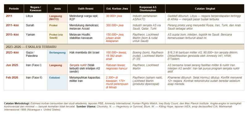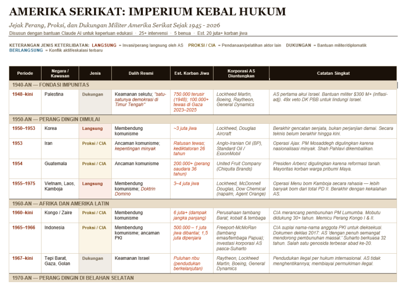 Amerika Serikat bisa terus melakukan semua ini—dari Teheran 1953 hingga Teheran 2026, dari Kinshasa hingga Kabul, dari Managua hingga Minab—bukan semata-mata karena senjatanya paling banyak dan lengkap atau karena mesin ekonominya haus akan minyak dan mineral. Ia bisa melakukannya karena selama delapan dekade ia telah merancang sebuah tatanan global di mana dirinya sendiri kebal hukum; di mana lembaga-lembaga yang seharusnya mengawasi justru menjadi instrumen untuk melegitimasi atau setidaknya mendiamkan agresinya; dan di mana korporasi yang mengambil keuntungan dari setiap bom yang dijatuhkan memiliki kepentingan langsung untuk memastikan bom-bom berikutnya terus dipesan, diproduksi, dan dikirim untuk mengamankan profit agar terus mengalir.